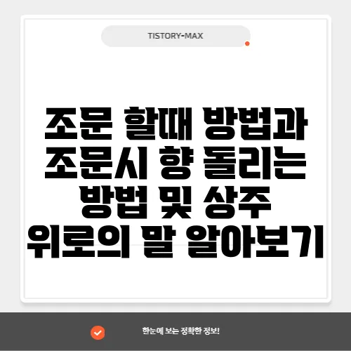 고인에 대한 조문은 한국 사회에서 고인의 삶을 기리고 애도하는 중요한 의식입니다. 이러한 조문을 통해 고인의 가족과 가까운 지인들에게 condolences를 전하고, 그들의 슬픔을 함께 나누는 것입니다. 그러나 어떻게 조문을 해야 할지, 조문 시 향을 돌리는 방법, 그리고 상주에게 전해야 할 위로의 말은 많은 이들이 궁금해하는 부분입니다. 따라서 이번 글에서는 조문을 할 때의 매너와 절차를 상세히 설명드리고, 조문할 때 향을 어떻게 돌리는지, 그리고 상주에게 어떤 말을 전해야 할지를 살펴보겠습니다. 이를 통해 처음 경험하는 분들이 보다 나은 인사를 건네는 데 도움이 되고자 합니다. 💡 조문 시 꼭 알아야 할 예절과 방법! 👉 조문 시 꼭 알아야 할 예절과 방법! 조문 방법에 대한 이해조문을 가기 전,..